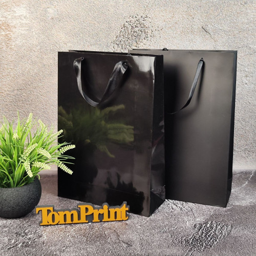Чорний глянцевий крейдований пакет ШxВxГ 250x350x90 мм, 200 г/м2, дно та ручки укріплені картоном