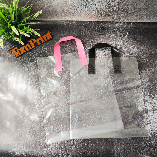 Пакет "петля" прозорий 30x35см, 60 мкм, ПВТ, донна складка 3 см, ручка біла/чорна/рожева